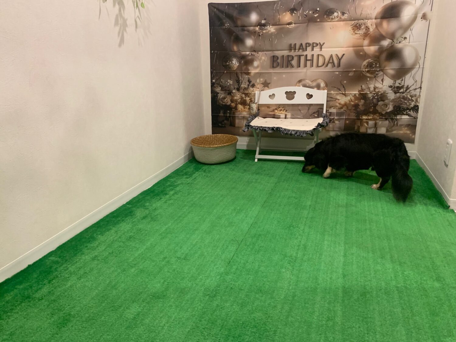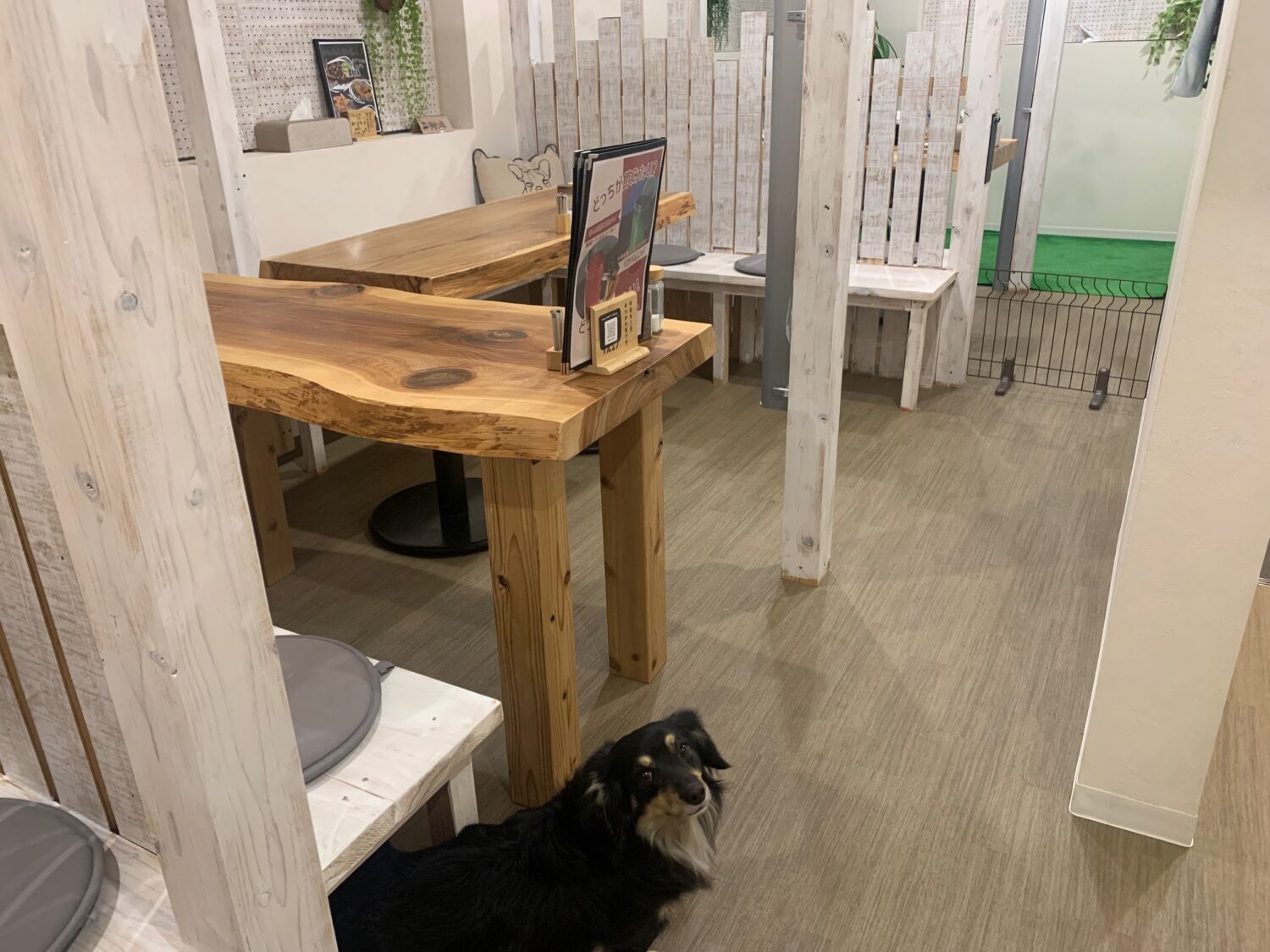 テーブルの奥側にフォトスポットも!食事しながら、ゲージもあって、わんちゃんが遊べるスペースがあるなんて、いいですね~。さっそくクン活しています。
