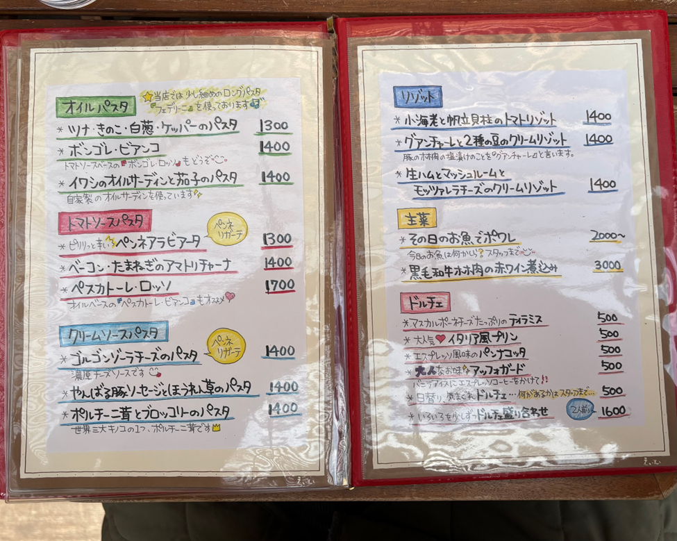 種類の豊富なパスタにピザやワイン、おつまみ系などたくさんのメニューがあり