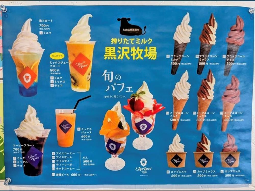 黒沢牧場のしぼりたてミルクを使用したソフトクリーム・パフェ・フロートなどがあります。