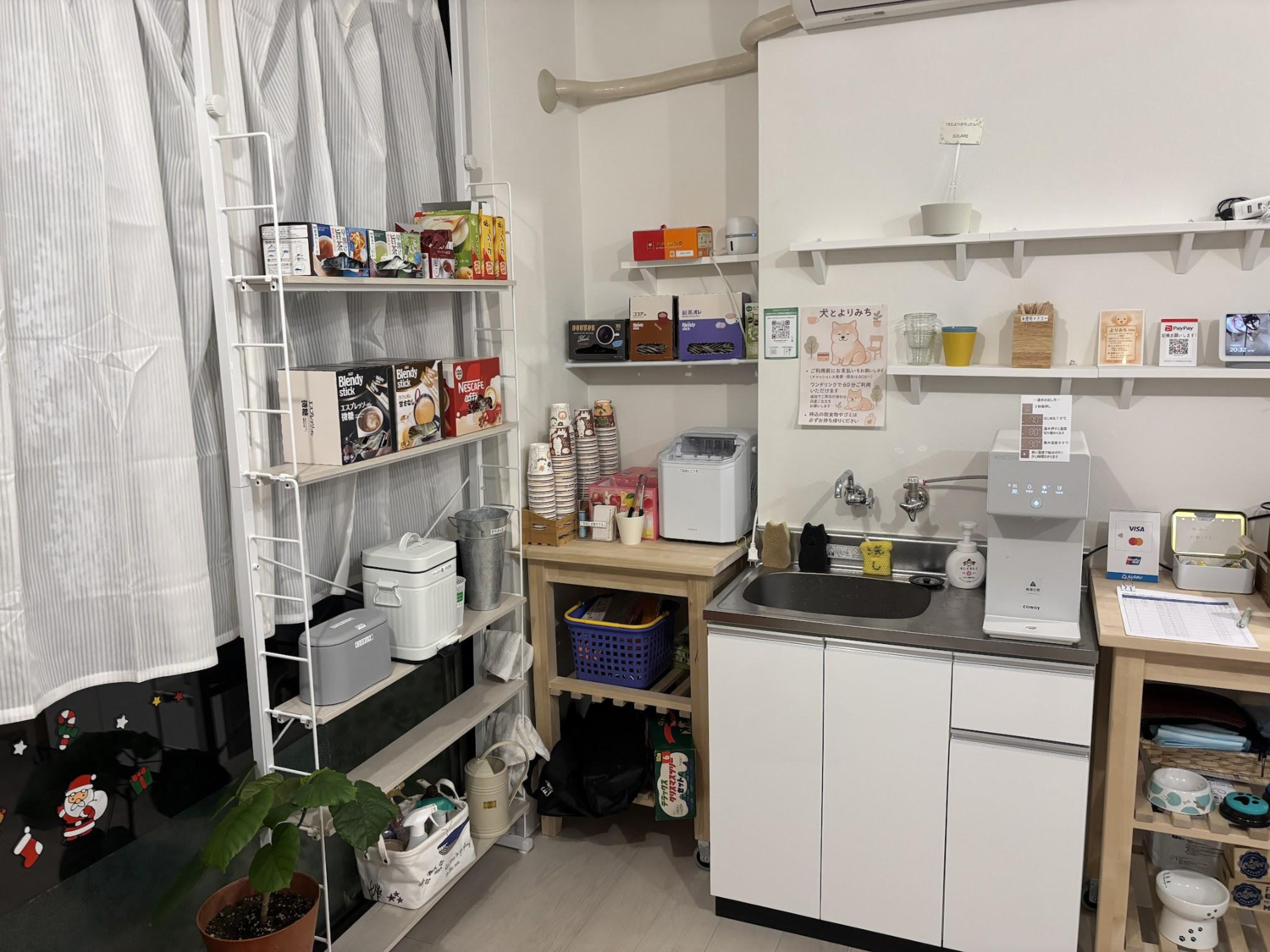 セルフドッグカフェの利用料金は1時間ワンドリンク付きで300円です。コーヒー、紅茶、カップスープ等の飲み物が用意されています。台所の横に清算スペースが設けられていて、用紙に名前(ワンちゃんの名前で可)と金額と支払い方法を記入して、代金を支払ってから利用してくださいね。