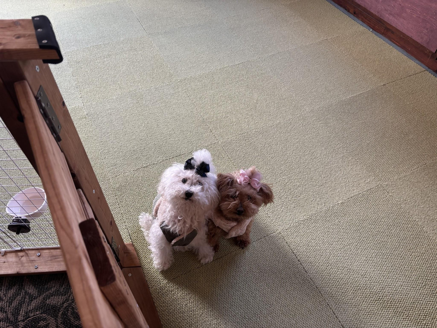 ココちゃんとレオちゃんが一緒になってママを見つめているところです。「ママも中に入って一緒に遊ぼうよ!」