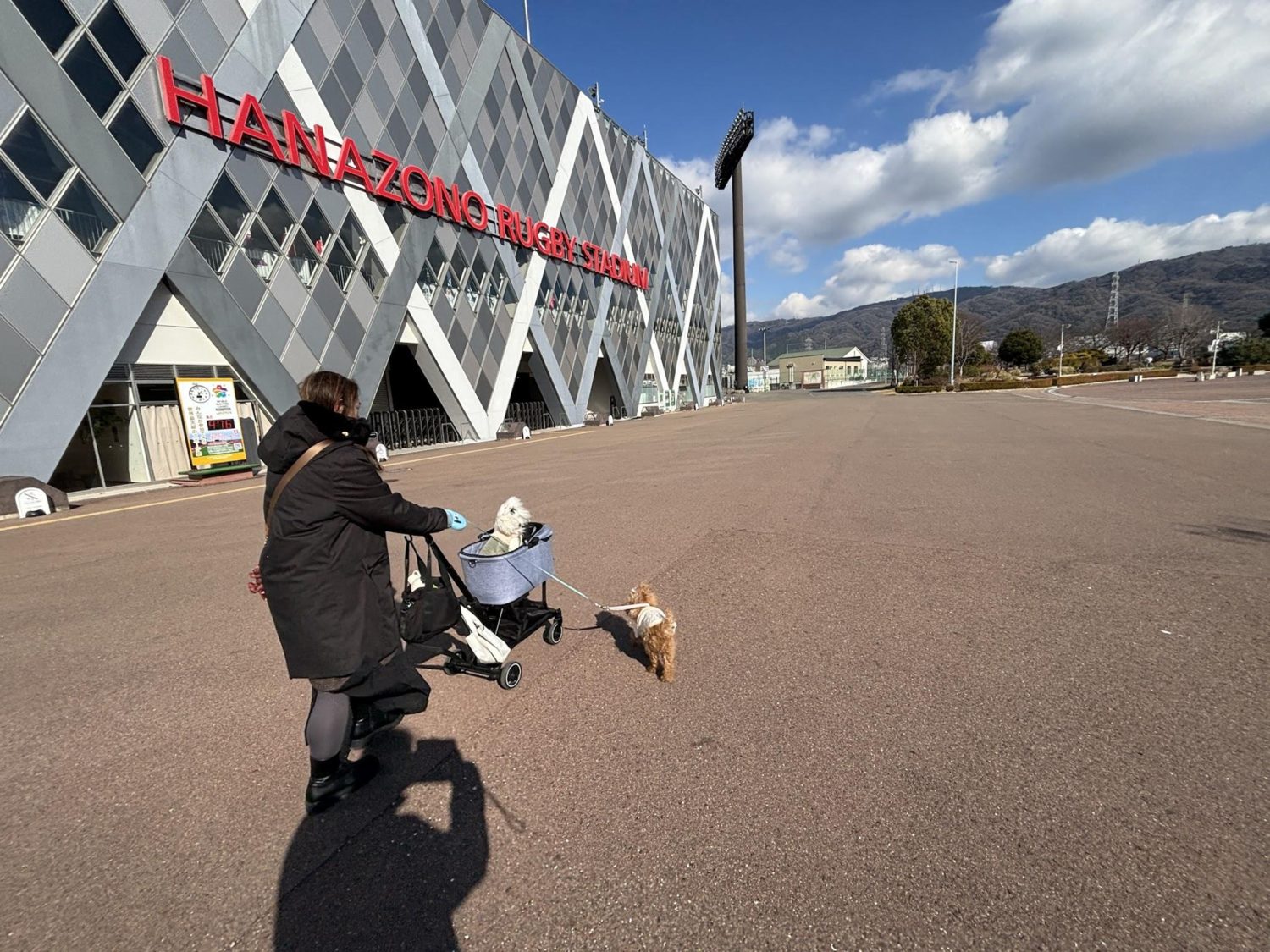 お店訪問の前に花園中央公園の駐車場に車を停めて高校ラグビーの全国大会の会場で有名な花園ラグビー場の前を散歩しました。
