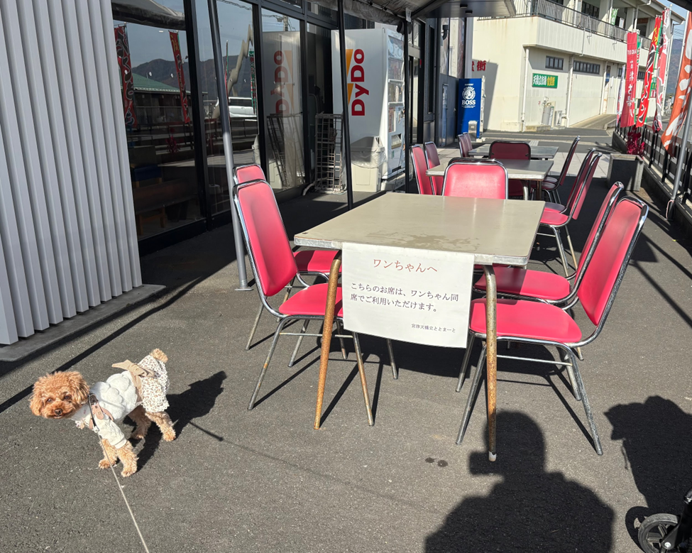 ちゅらは残念ですがお店の中へは入れないのでわんこOKのテラス席でパパと少し待っててもらいます。