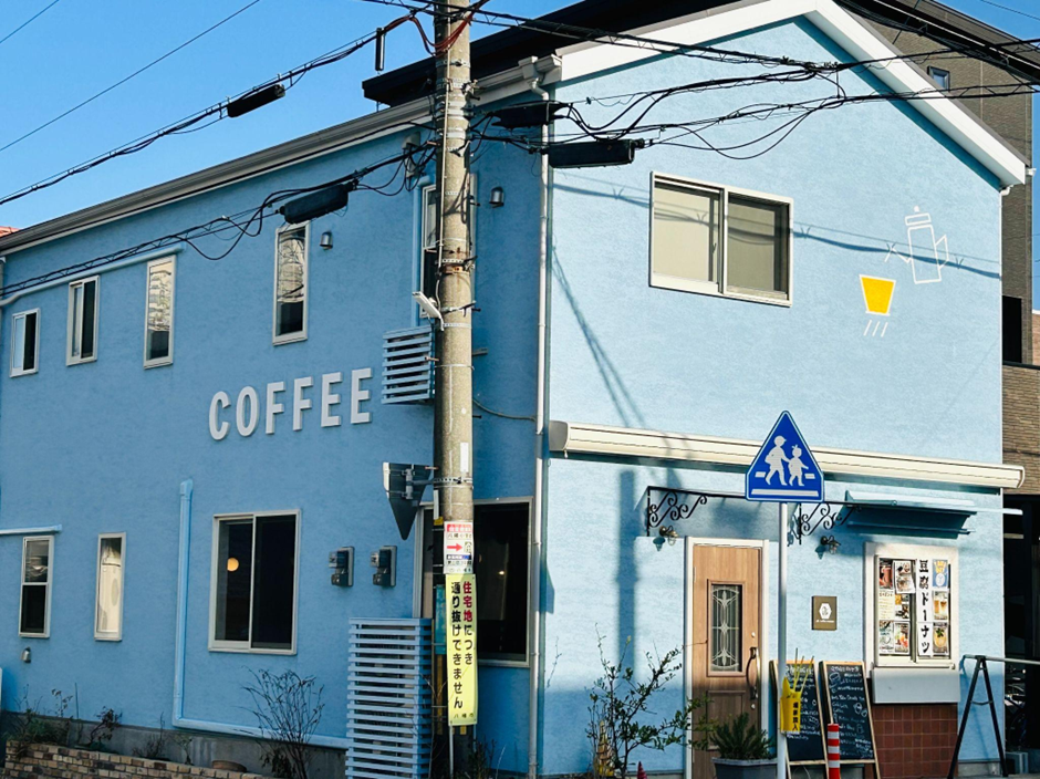 空色の外壁に大きく並ぶ「COFFEE」の文字。右上には、白いラインで描かれたコーヒーポットと黄色いカップ!シンプルなのに、青空に映えて、遠くからでも目を引きます。