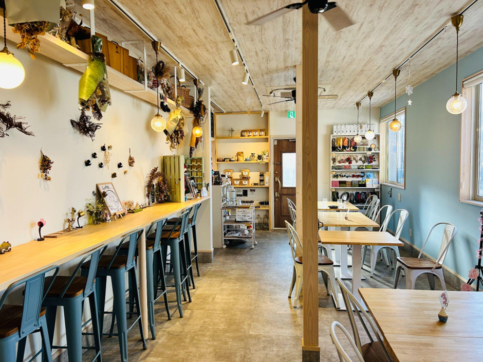扉を開けると、木のカウンターがすっと伸び、その上にはドライフラワーや小さな雑貨。やわらかな照明が灯り、自然光がやさしく差し込みます。