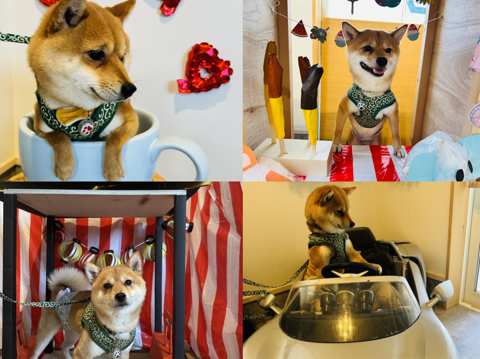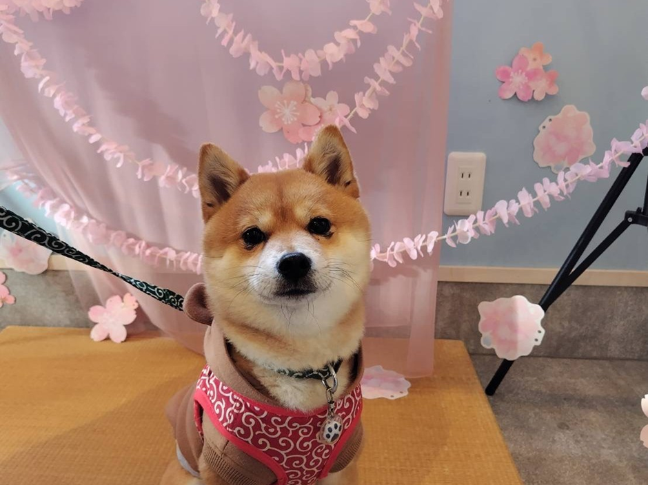 今回は満開の桜をイメージした背景の前で、りきのおすまし顔が撮れました!