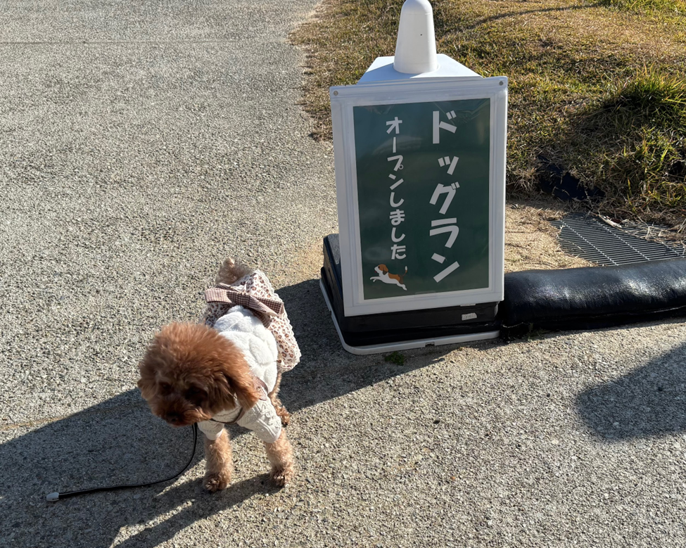 入り口すぐのところにドッグランオープンしましたと張り紙を発見!