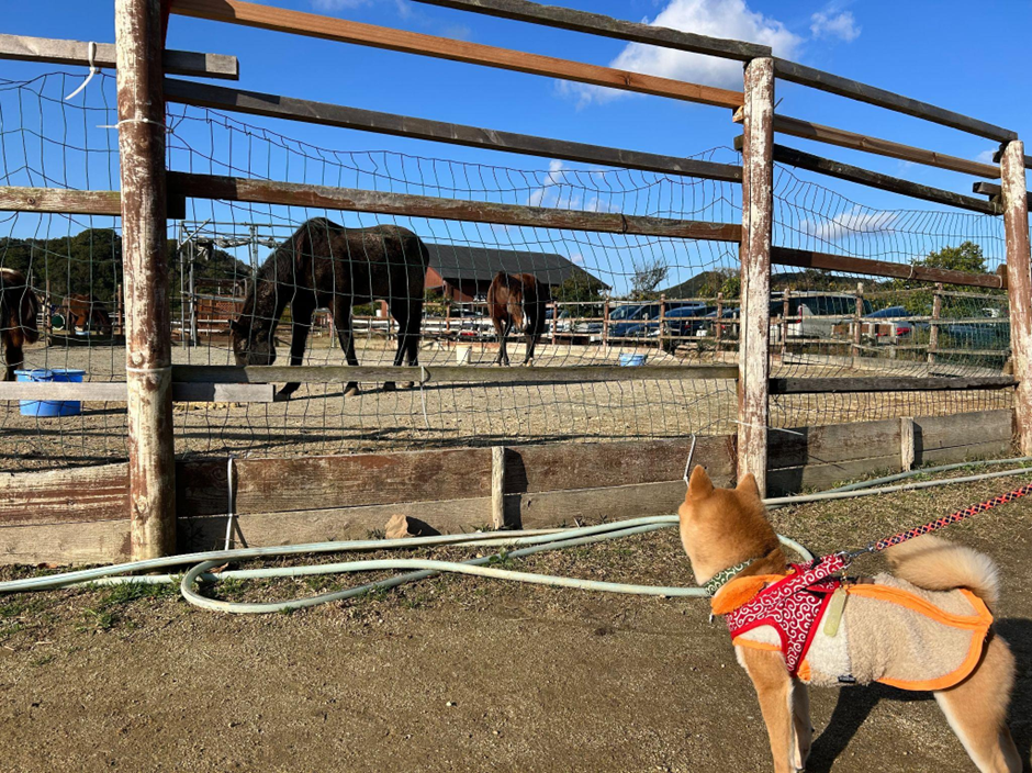 イルカの他に、馬を見学できるエリアもあり、のんびりとした雰囲気の中で動物たちの姿を楽しめます。馬には、興味を持ったのか?珍しくじっと見つめていました。