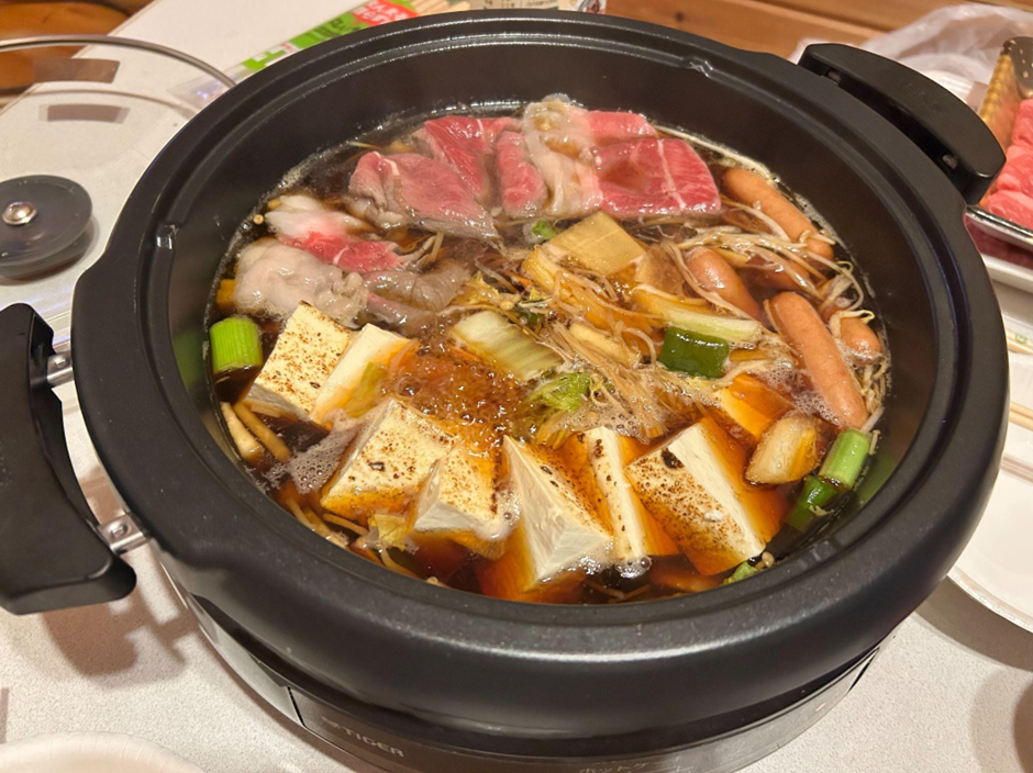 今回の夕食は、すき焼きにしました。じゃのひれアウトドアリゾートに行くまでにスーパーマーケットやドラッグストア、コンビニがあるので、買い出しには困りませんでした。