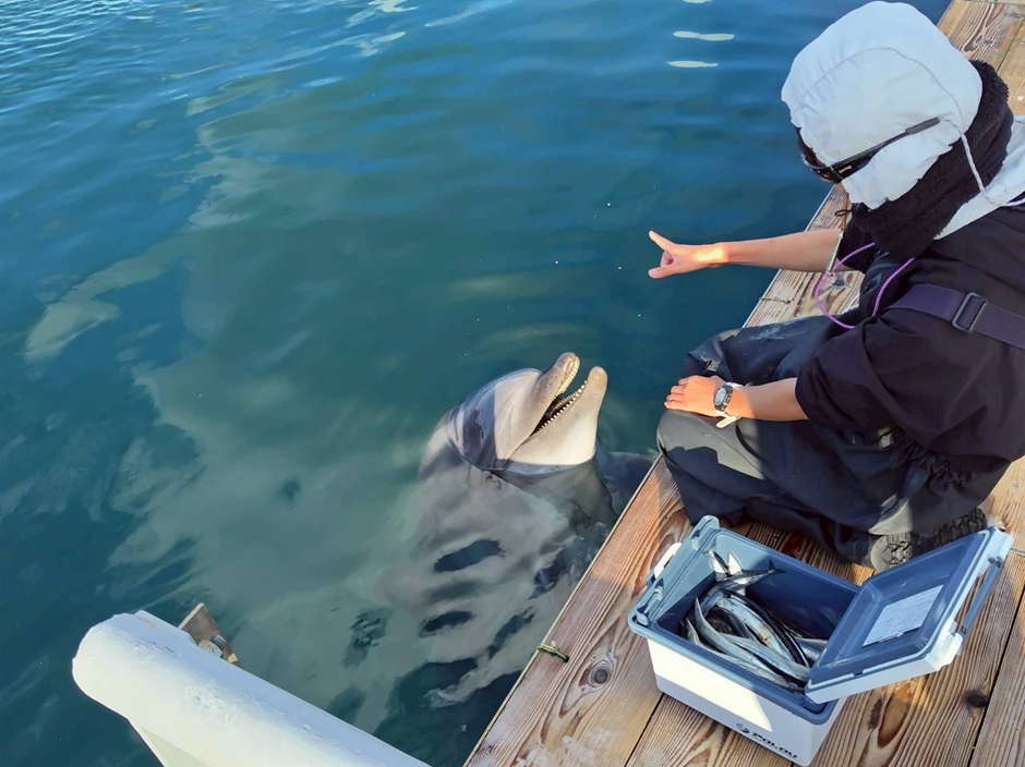 淡路島じゃのひれアウトドアリゾート内のフィッシングパークでは、敷地内でイルカを間近に見られる体験が用意されています。